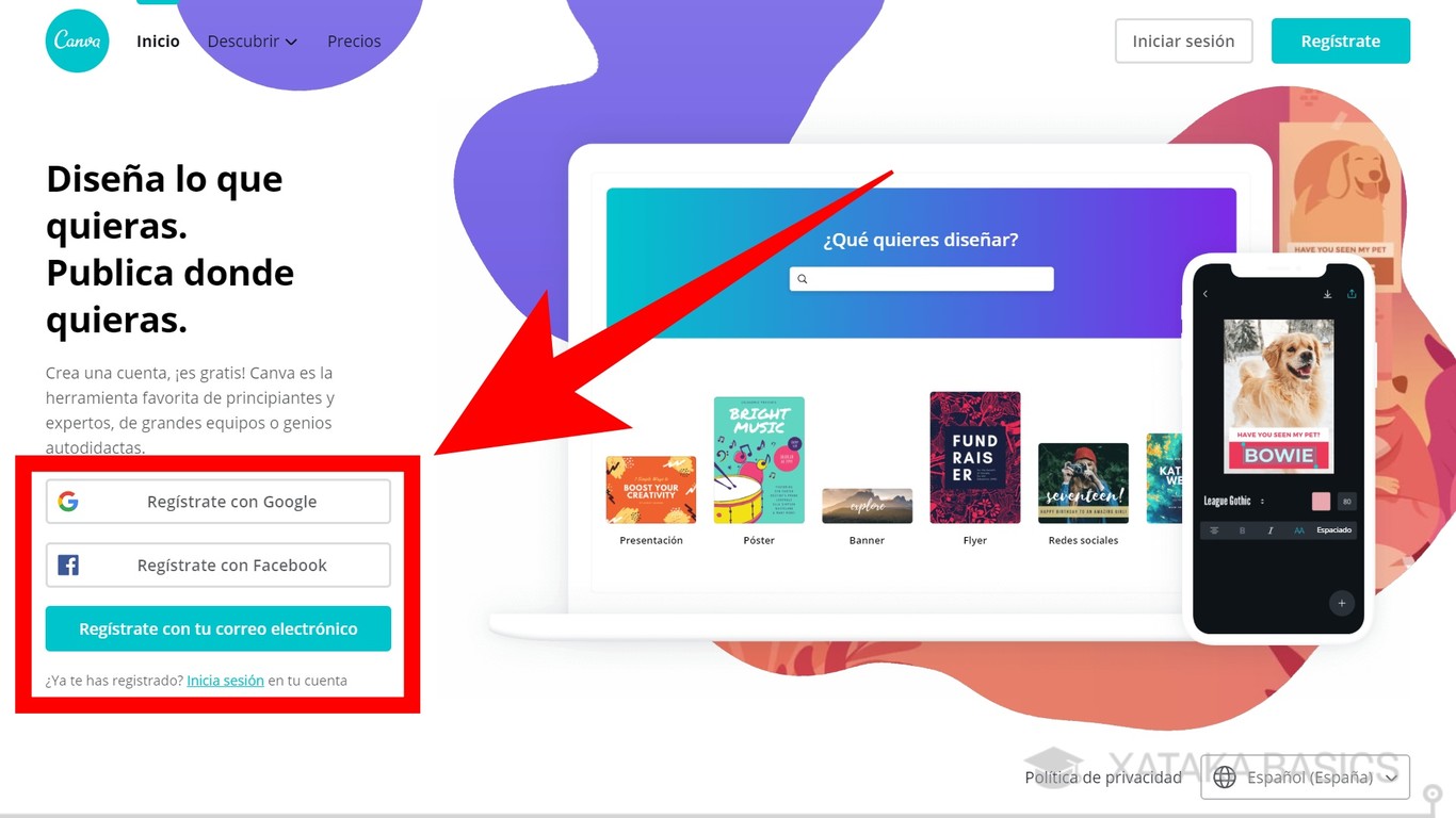 Para utilizar Canva, lo primero que debes hacer es crearte una cuenta de usuario. Puedes hacerlo utilizando tus datos de Google, los de Facebook, o simplemente con tu correo y contraseña. Debajo de estas opciones tendrás la de iniciar sesión por si ya tienes una cuenta creada.